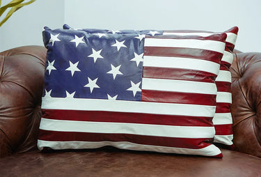 Make a bold statement with the USA Flag Rectangle Cushion, a unique accent piece crafted from 100% genuine cow leather and enhanced with a vivid sublimation flag print. Its elongated rectangular shape offers a modern twist, perfect for layering with square cushions or styling as a standout piece on sofas, armchairs, or beds.